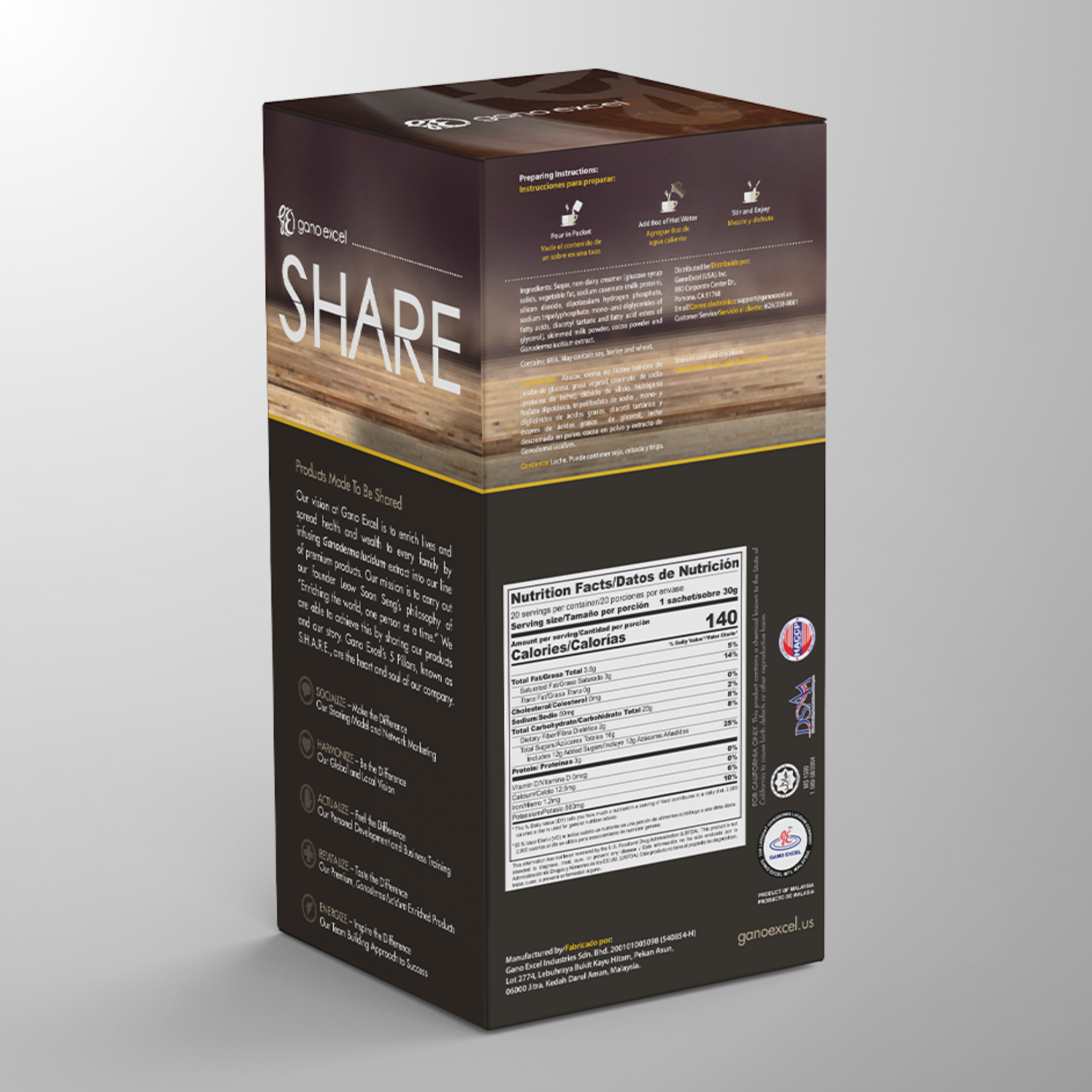 Contiene extracto de Ganoderma Lucidum, cacao, crema no láctea, azúcar refinada y leche descremada.