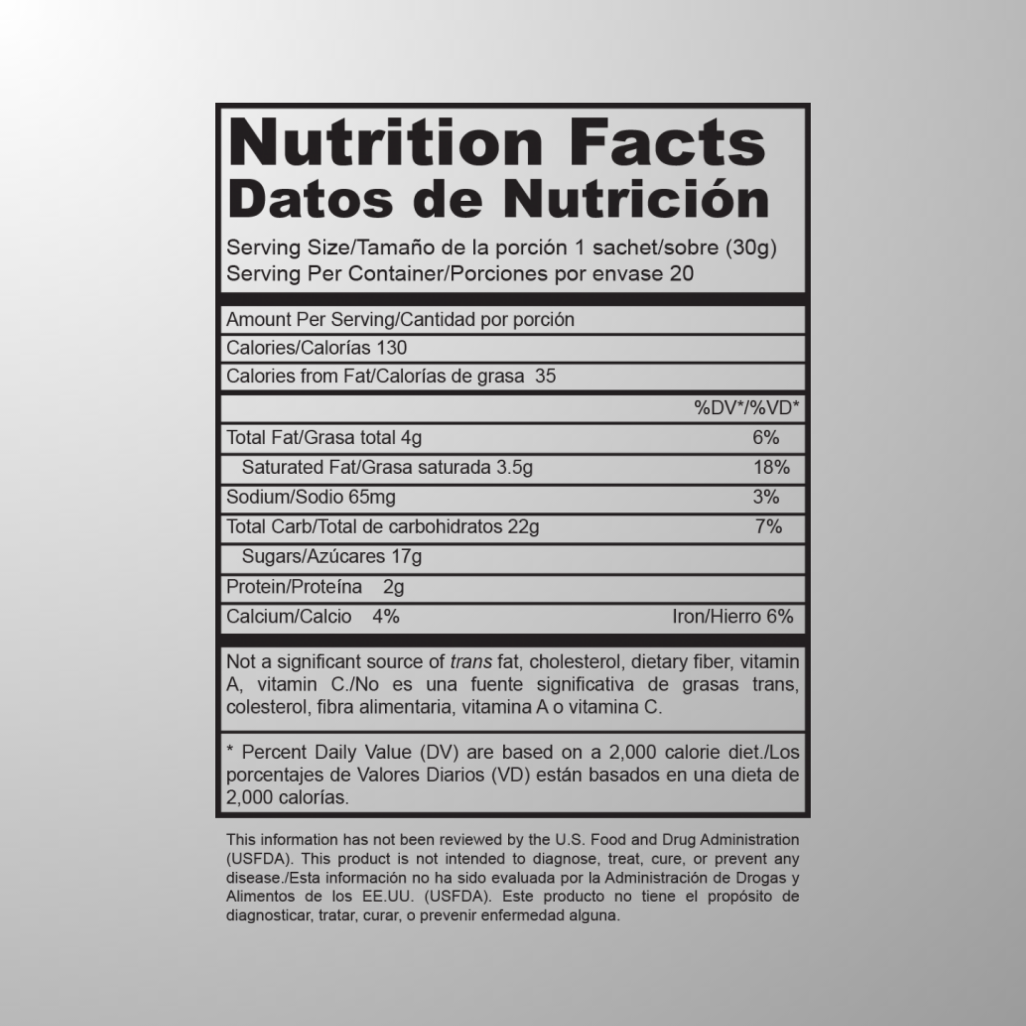 No contiene grasas trans, colesterol, fibra alimentaria, vitamina A ni vitamina C.